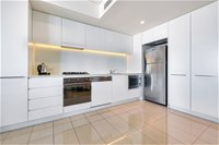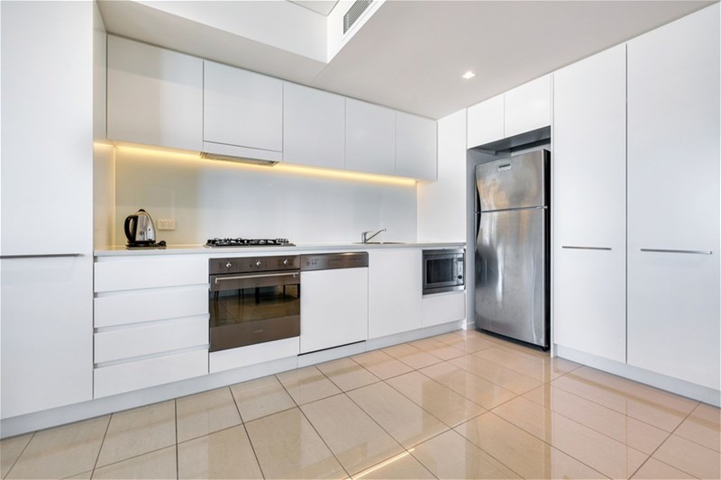 The open plan living area is further enhanced by the cleverly placed kitchen which is positioned along the side and front walls. This not only maximises your personal space, but also provides a generous amount of bench and cupboard space. The colour coded dishwasher, stainless steel appliances and clean white stone benches atop the white cupboards, helps blend this space seemlessly in to the apartment.